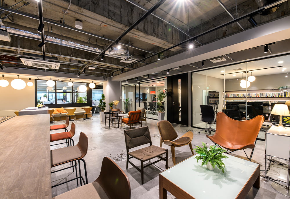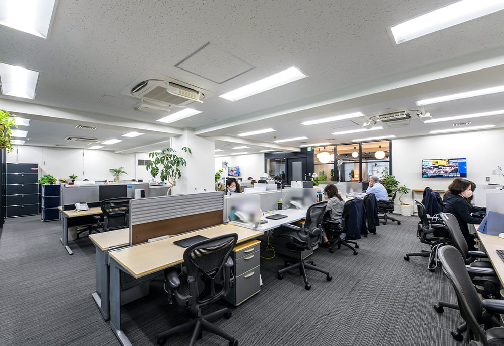 6階のオフィスには広いラウンジと執務エリア、さらに来客用の会議室を配置。エントランスのラウンジは、お客様をお迎えする場所であると同時に打合せや社員同士の交流など、多目的に利用できるオープンなスペース。全員分のデスクが用意された執務エリアにはリフレッシュスペースもあり、外堀通りを見下ろしながらランチを食べたり、一人掛けチェアでパワーナップをしたり、自由にくつろぐことができます。