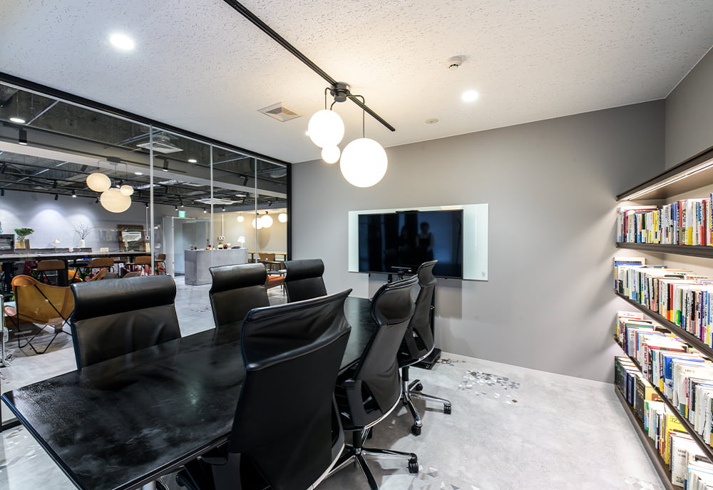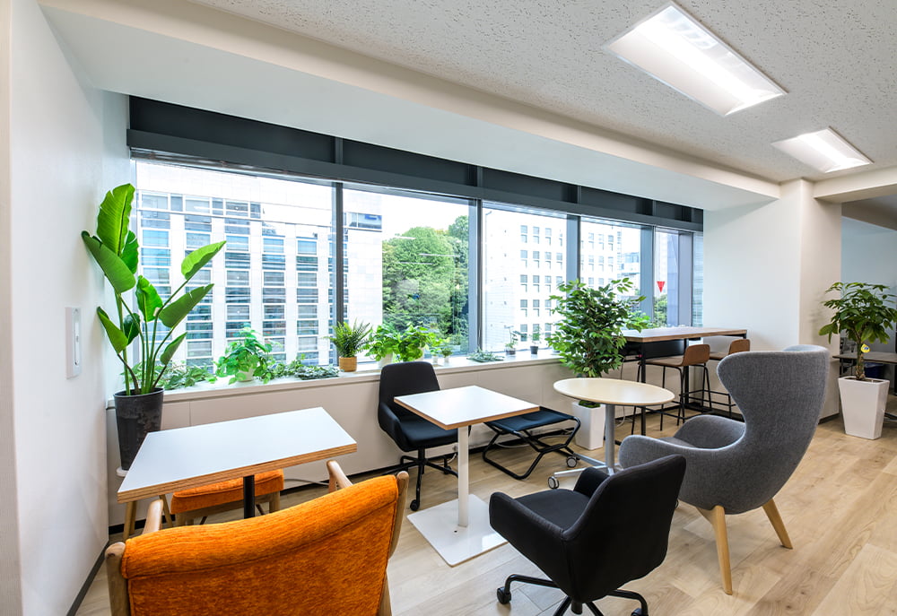 6階のオフィスには広いラウンジと執務エリア、さらに来客用の会議室を配置。エントランスのラウンジは、お客様をお迎えする場所であると同時に打合せや社員同士の交流など、多目的に利用できるオープンなスペース。全員分のデスクが用意された執務エリアにはリフレッシュスペースもあり、外堀通りを見下ろしながらランチを食べたり、一人掛けチェアでパワーナップをしたり、自由にくつろぐことができます。